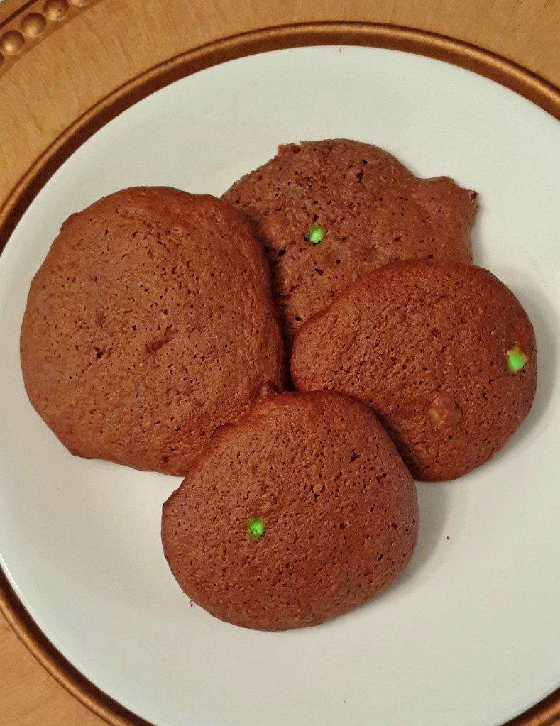 Me? Airbake cookie sheets, parchment paper and….. as well as flour and I get along, I make Cake mix cookies and add some fun stuff to all varieties. Tonight was . German Chocolate with Andes Mint bits !